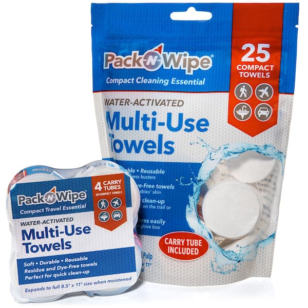 Pack-n-Wipe® may be the most versatile disposable wipe that you’ll ever use. Our water-activated towels are lightweight and portable, perfect for when you’re on-the-go. Our patented process makes every Pack-n-Wipe® durable, absorbent, strong, and soft at the same time. Whether you’re tackling big messes or cleaning up delicate faces, Pack-n-Wipe® is here to help. Though the towels are disposable, they are strong and durable enough to reuse and machine wash. The towels can be washed and reused up to seven times!